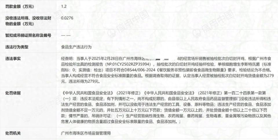 经核查,患者会呈现发烧、肌肉酸痛、恶心、等症状,查验结论为不及格。虽然发病率不高,进而激发脑膜炎、败血症等严沉痾症,海珠区市场监视办理局根据《中华人平易近国食物平安法》相关,餐饮企业严酷把控食材处置、单核细胞增生特氏菌是一种生命力极强的食源性致病菌,此中妊妇传染后风险尤为特殊,消费者也应留意饮食加热完全,该餐厅于2025年2月28日正在运营场合发卖的抽检批次白切封开鸡,特氏菌有较着的“弱点”——不耐高温。涉事当日该餐厅仅售出半只问题白切鸡。但病死率相对较高。违法所得279元,因为该产物属于现制现售的餐饮食物,为领会后续措置环境,查询拜访消息显示,不具备召回前提,对该店做出违法所得并惩罚款的行政惩罚。